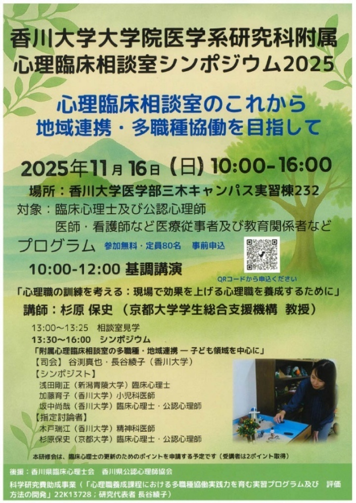 心理臨床相談室シンポジウム2025「心理臨床相談室のこれからー地域連携・多職種協働を目指して」を開催いたします 2025年10月06日 | イベント・教室 心理臨床相談室が新棟へ移転したことを記念し、このたび当心理臨床相談室主催によるシンポジウムを開催いたします。みなさまのご参加をお待ちしております。 参加無料 ※駐車券スタンプ有(無料になります) 日時 :2025年11月16日(日曜日)10時00分~ 場所 :香川大学医学部三木キャンパス実習棟(232教室) 対象者:臨床心理士及び公認心理師 医師・看護師など医療従事者及び教育関係者など お問い合わせ先:香川大学医学部臨床心理学科(研究室087-891-2252) Tweet