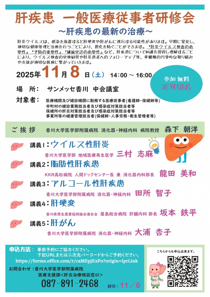 トップページ › お知らせ › 医療関係者 › 令和7年度 肝疾患一般医療従事者研修会~肝疾患の最新の治療~ のお知らせ