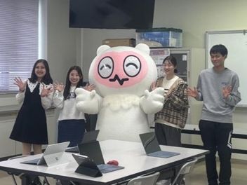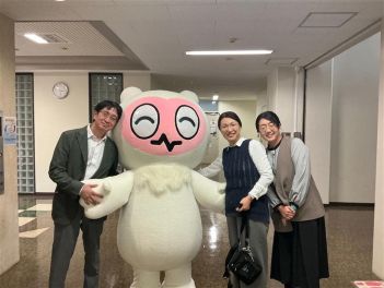 香川大学医学部附属病院公式キャラクター「くーちゃん」が地域看護学教室に来てくれました。「くーちゃん」は、学内外の様々なイベントで活躍する人気者です。今回は、芳我ゼミ・川本ゼミで卒業論文に取り組んでいる看護学科4年生の学生と交流し、持ち前の愛らしい仕草で和ませてくれました。学生や教員の表情にも自然と笑顔があふれ、教室全体がはつらつとした雰囲気となりました。
