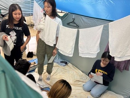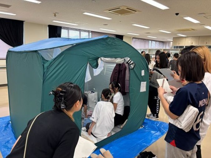 演習室の一角には、公衆衛生看護学コース1年生が研究成果をもとに、高齢女性の生活を想定した避難所の居住スペースを再現しました。学生たちは実際にテント内に入り、観察しながら、「薬の管理はできているだろうか」「布団から起き上がるのは大変そうだ」など、生活者の視点から避難所の生活環境における課題を考えました。また、段ボールベッド等を実際に体験し、利点と課題を考察しました。今回の演習を通して、避難生活における看護の役割理解を深める機会となったようです。