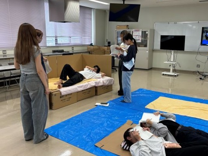 看護学科4年次生を対象とした必修科目「防災・災害看護」の授業では、香川大学医学部附属病院看護師の協力のもと、災害時の避難所における生活と看護についての演習を実施しました。