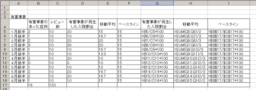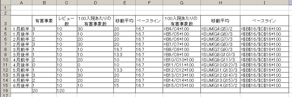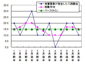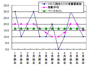 半月毎に、@1000 入院日数(1000 人日)あたりの有害事象数、A100 入院あたりの有害事象 数、B有害事象が発生した入院の割合(%)、を算出し、グラフにプロットします。また6
