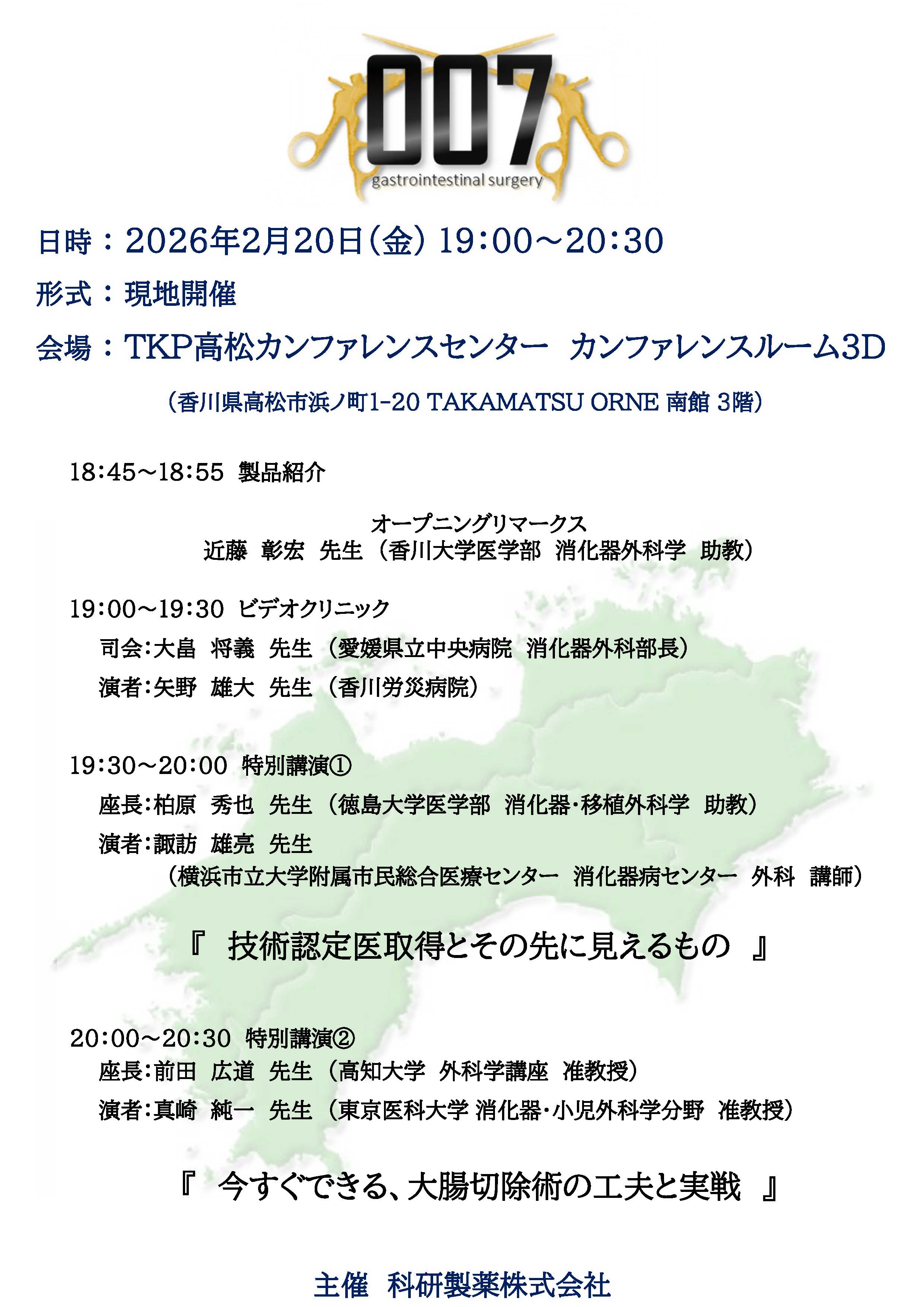2026年2月20日に科研製薬株式会社主催で「007 in 四国」がTKP高松カンファレンスセンターで開催されます。特別講演①には横浜市立大学附属市民総合医療センター 消化器病センター 外科 講師 諏訪雄亮先生をお招きし「技術認定医取得とその先に見えるもの」と題して、特別講演②には東京医科大学 消化器・小児外科学分野 准教授 真崎純一先生をお招きし「今すぐできる、大腸切除術の工夫と実践」と題してそれぞれご講演頂きます。是非ご参加ください。
