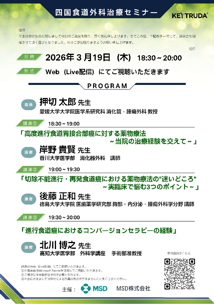 お知らせ 2026/3/19四国食道外科治療セミナー 【3/19(木)WEB】セミナーのご案内「四国食道外科治療セミナー」日時:2026年3月19日(木曜日) 18:30から20:00WEB:Teams (事前予約制)当科の岸野貴賢先生の食道胃接合部癌に対する治療の講演もございます。みなさまのご参加お待ちしております。 一覧へ戻る
