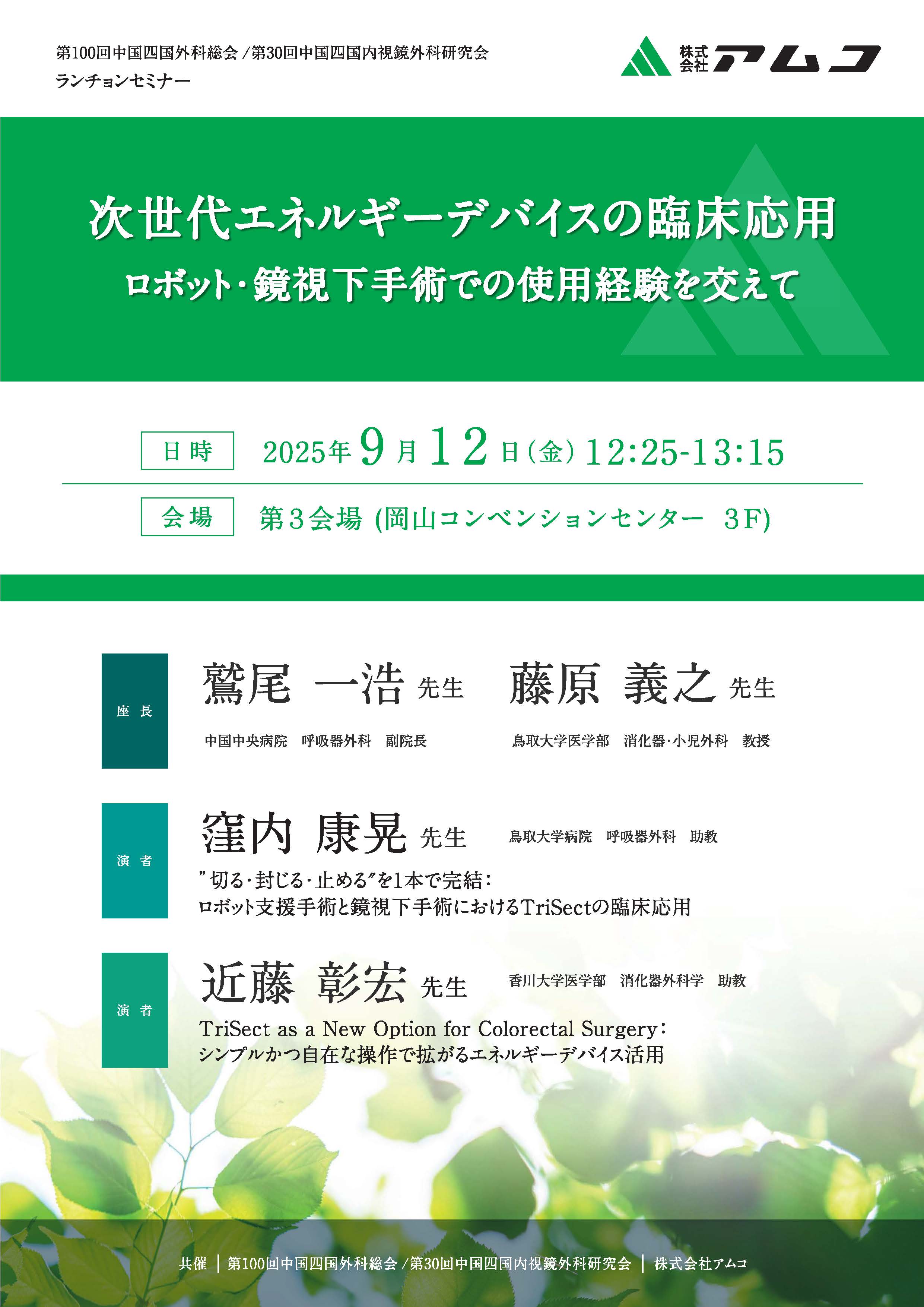 2025年9月11日、12日に第100回中国四国外科学会、第30回中国四国内視鏡外科研究会が開催されます。12日のランチョンセミナー6で、株式会社アムコ共催のもと「次世代エネルギーデバイスの臨床応用 〜ロボット・鏡視下手術での使用経験を交えて〜」が開催予定です。当科 助教 近藤彰宏が演者として登壇いたします。